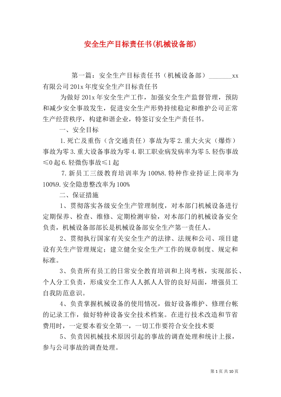 第1页共10页书山有路勤为径,学海无涯苦作舟。安全生产目标责任书(机械设备部)第一篇:安全生产目标责任书(机械设备部)_______xx有限公司...