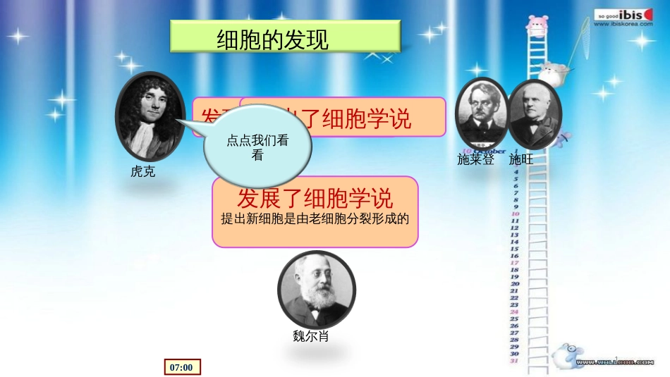 细胞的发现07:00发现并命名了细胞提出了细胞学说发展了细胞学说提出新细胞是由老细胞分裂形成的虎克施莱登施旺魏尔肖点点我们看看1一、细胞...