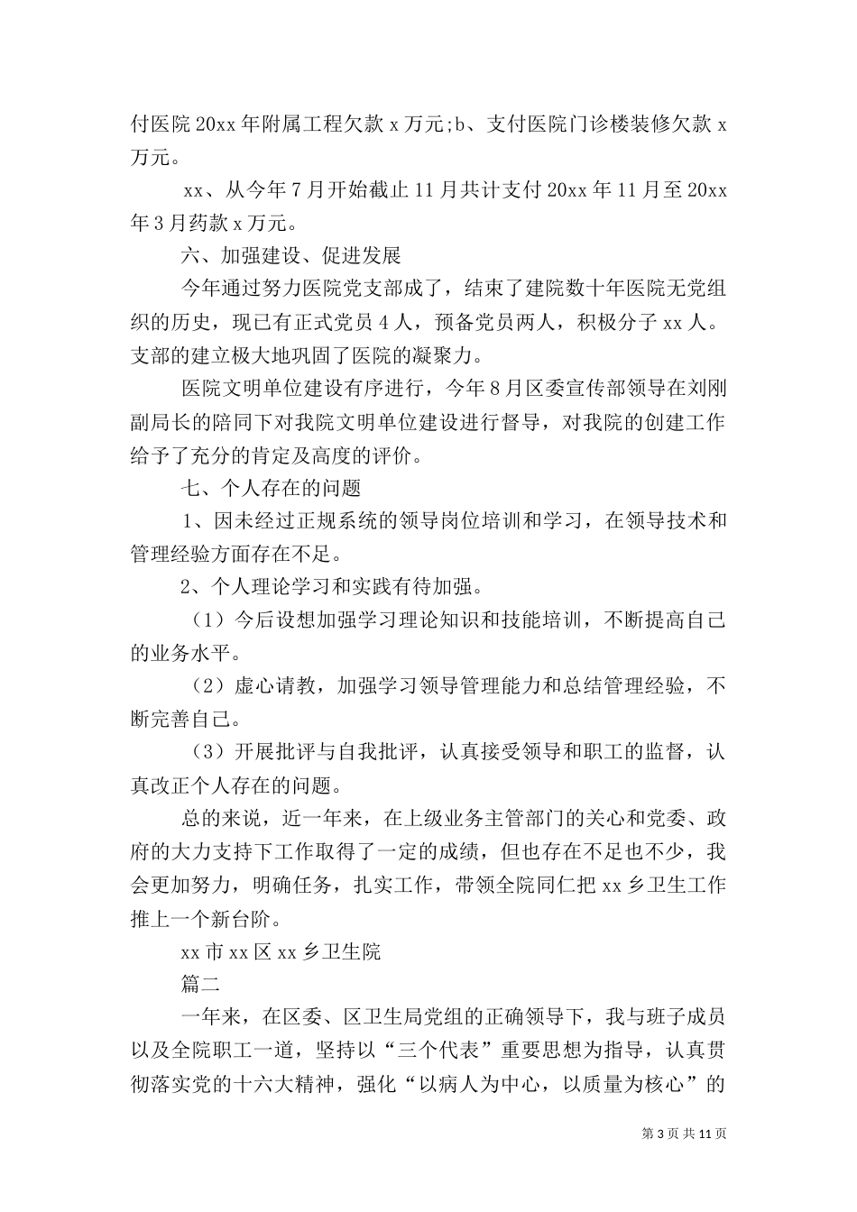 第1页共11页书山有路勤为径,学海无涯苦作舟。卫生院院长述职报告四篇篇一20xx年3月份受区卫生局委派担任xx乡卫生院院长,这近一年中,在乡...