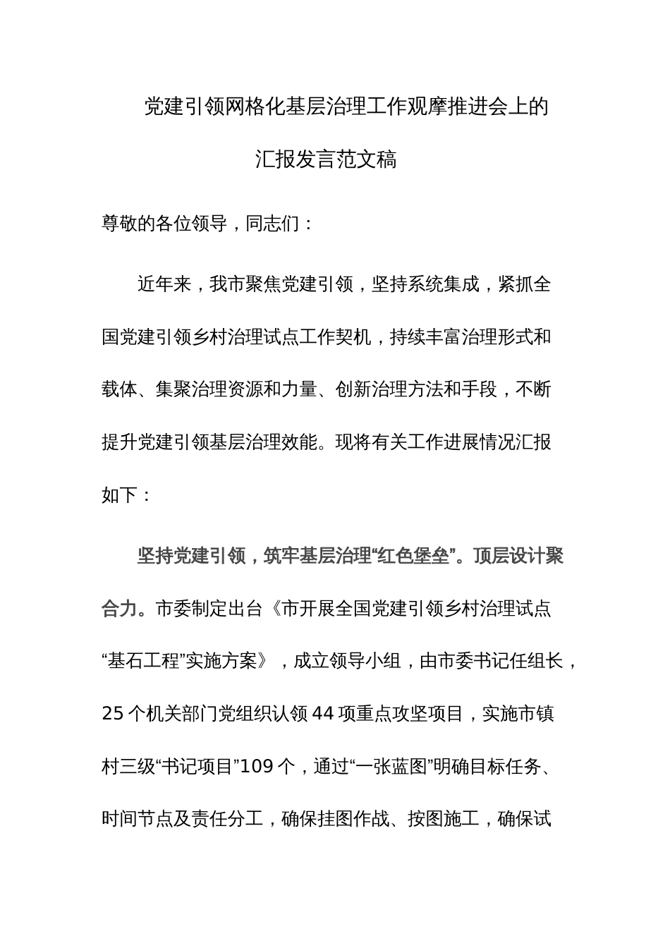 党建引领网格化基层治理工作观摩推进会上的汇报发言范文稿尊敬的各位领导,同志们:近年来,我市聚焦党建引领,坚持系统集成,紧抓全国党建...