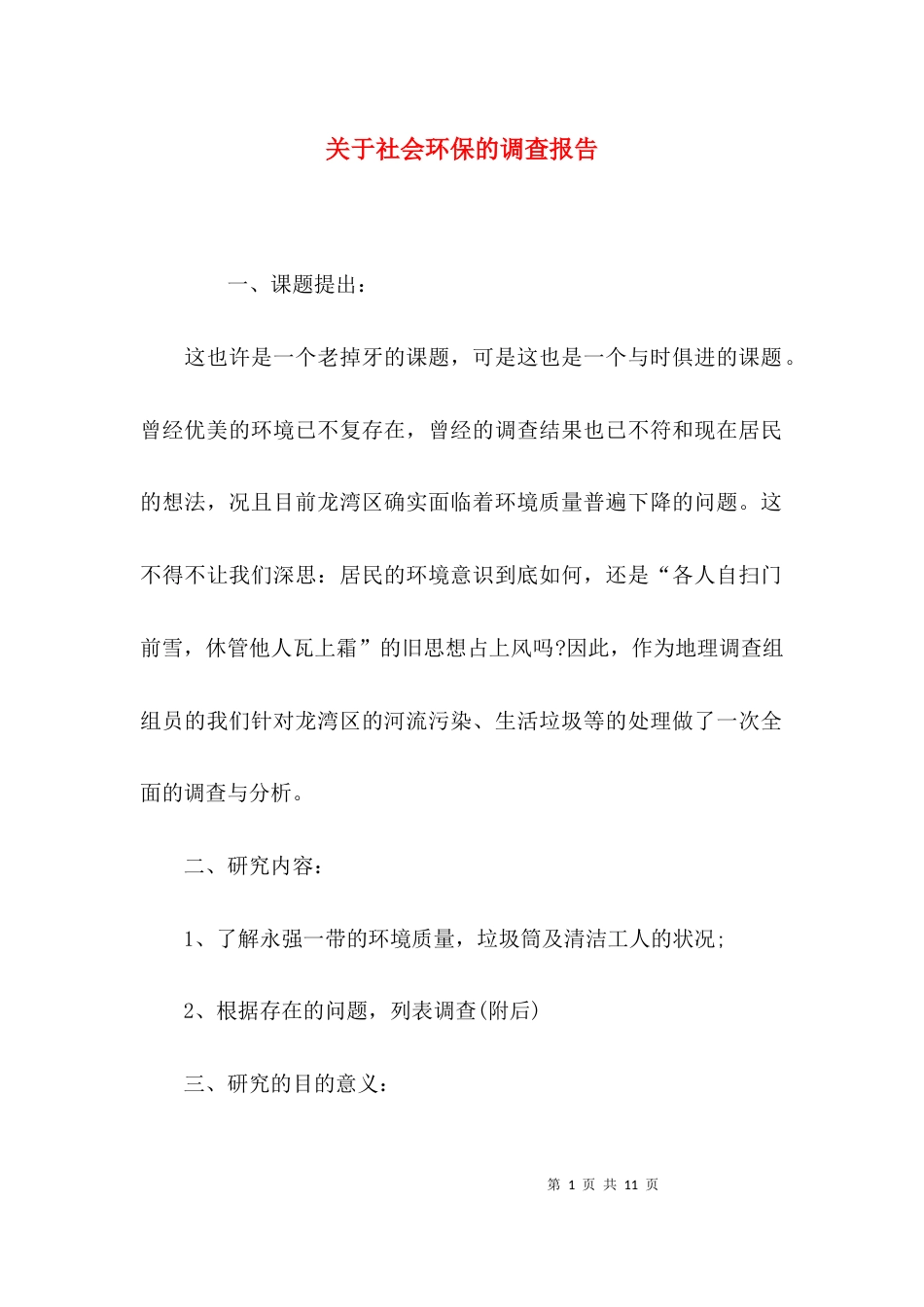 第1页共11页关于社会环保的调查报告一、课题提出:这也许是一个老掉牙的课题,可是这也是一个与时俱进的课题。曾经优美的环境已不复存在,...