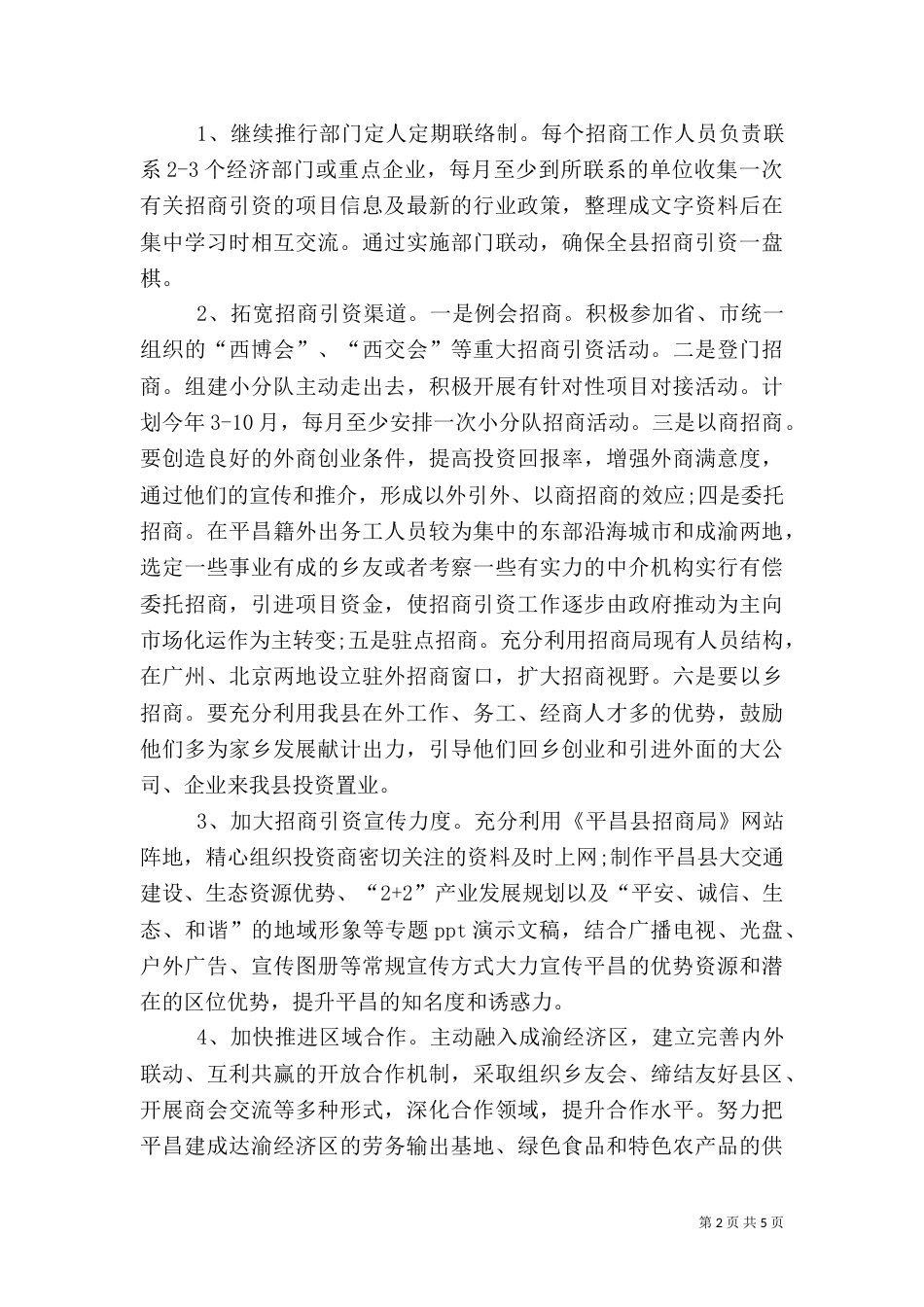 第1页共5页书山有路勤为径,学海无涯苦作舟。招商引资2021年工作计划范文(一)夯实基础,强化项目工作。1、狠抓项目生成和包装。紧紧围绕...