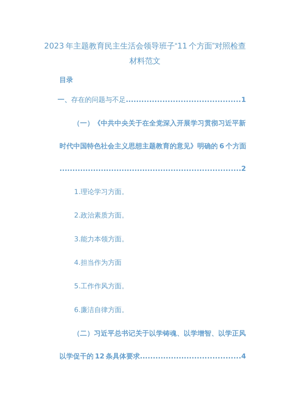 2023年主题教育民主生活会领导班子“11个方面”对照检查材料范文目录一、存在的问题与不足............................................1...
