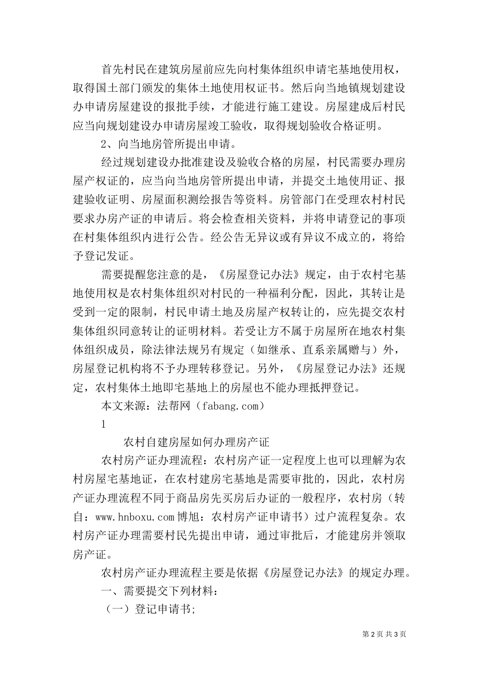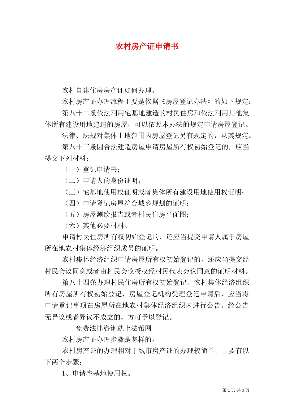 第1页共3页书山有路勤为径,学海无涯苦作舟。农村房产证申请书农村自建住房房产证如何办理。农村房产证办理流程主要是依据《房屋登记办法》...