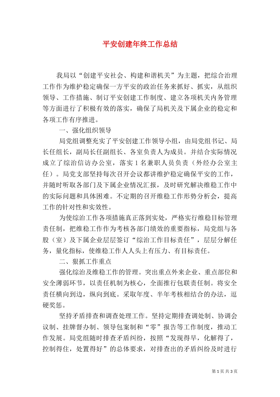 第1页共3页书山有路勤为径,学海无涯苦作舟。平安创建年终工作总结我局以“创建平安社会、构建和谐机关”为主题,把综合治理工作作为维护稳...