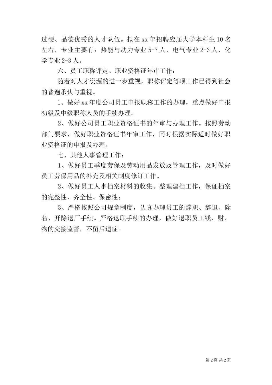 第1页共2页书山有路勤为径,学海无涯苦作舟。人事年度工作计划一、人员调配管理本年度重点做好新兴工业园投运期间的人员调配工作,人事年度...
