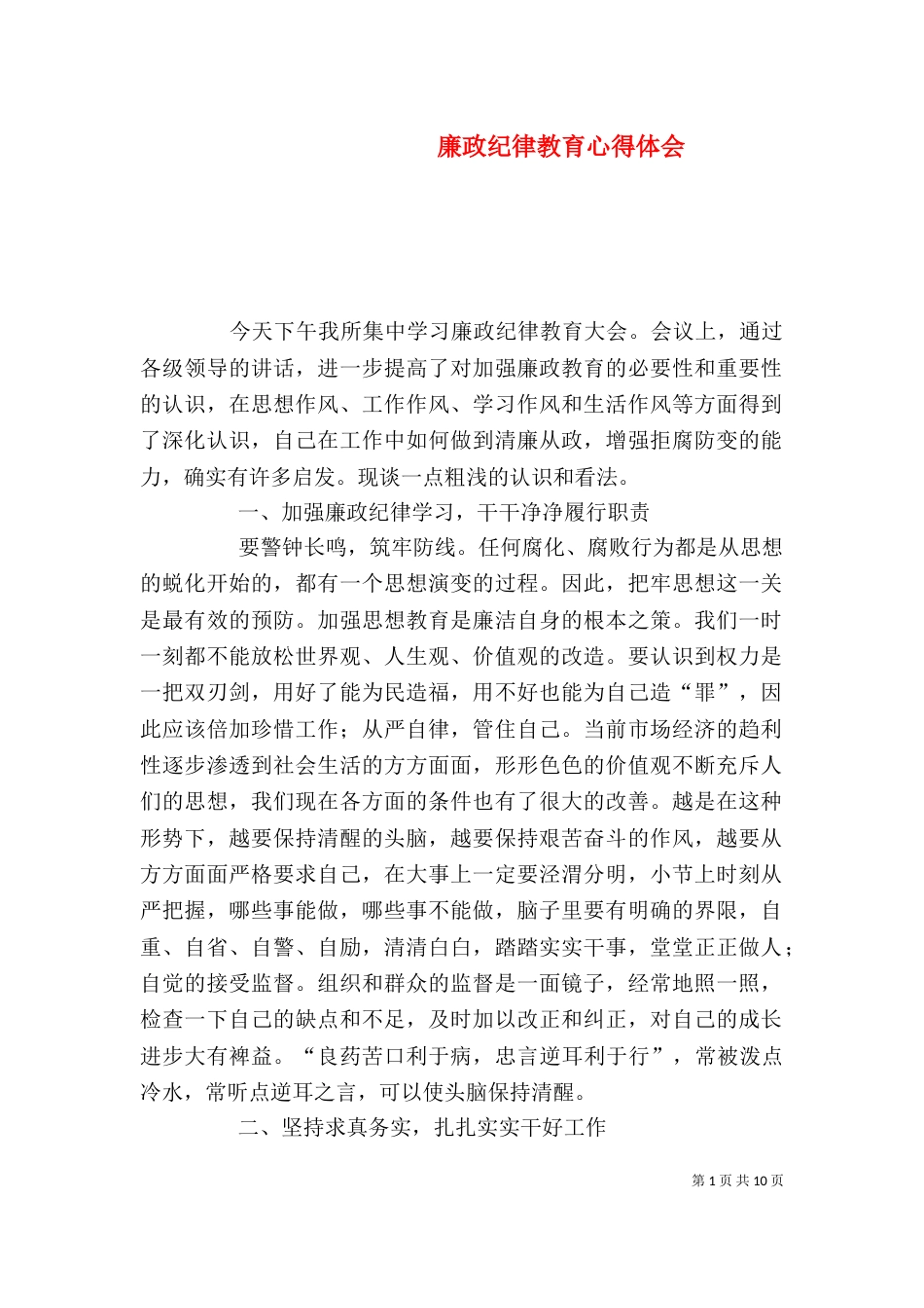 第1页共10页廉政纪律教育心得体会今天下午我所集中学习廉政纪律教育大会。会议上,通过各级领导的讲话,进一步提高了对加强廉政教育的必要...
