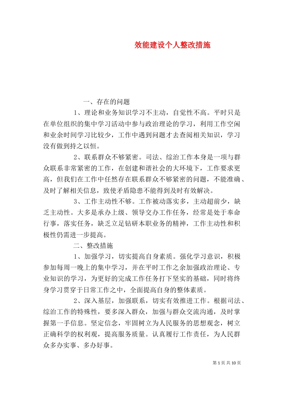 第1页共10页效能建设个人整改措施一、存在的问题1、理论和业务知识学习不主动,自觉性不高。平时只是在单位组织的集中学习活动中参与政治理...