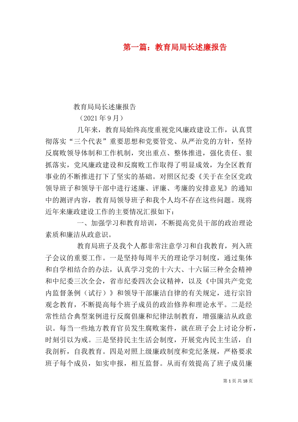 第1页共18页第一篇:教育局局长述廉报告教育局局长述廉报告(2021年9月)几年来,教育局始终高度重视党风廉政建设工作,认真贯彻落实“三个...