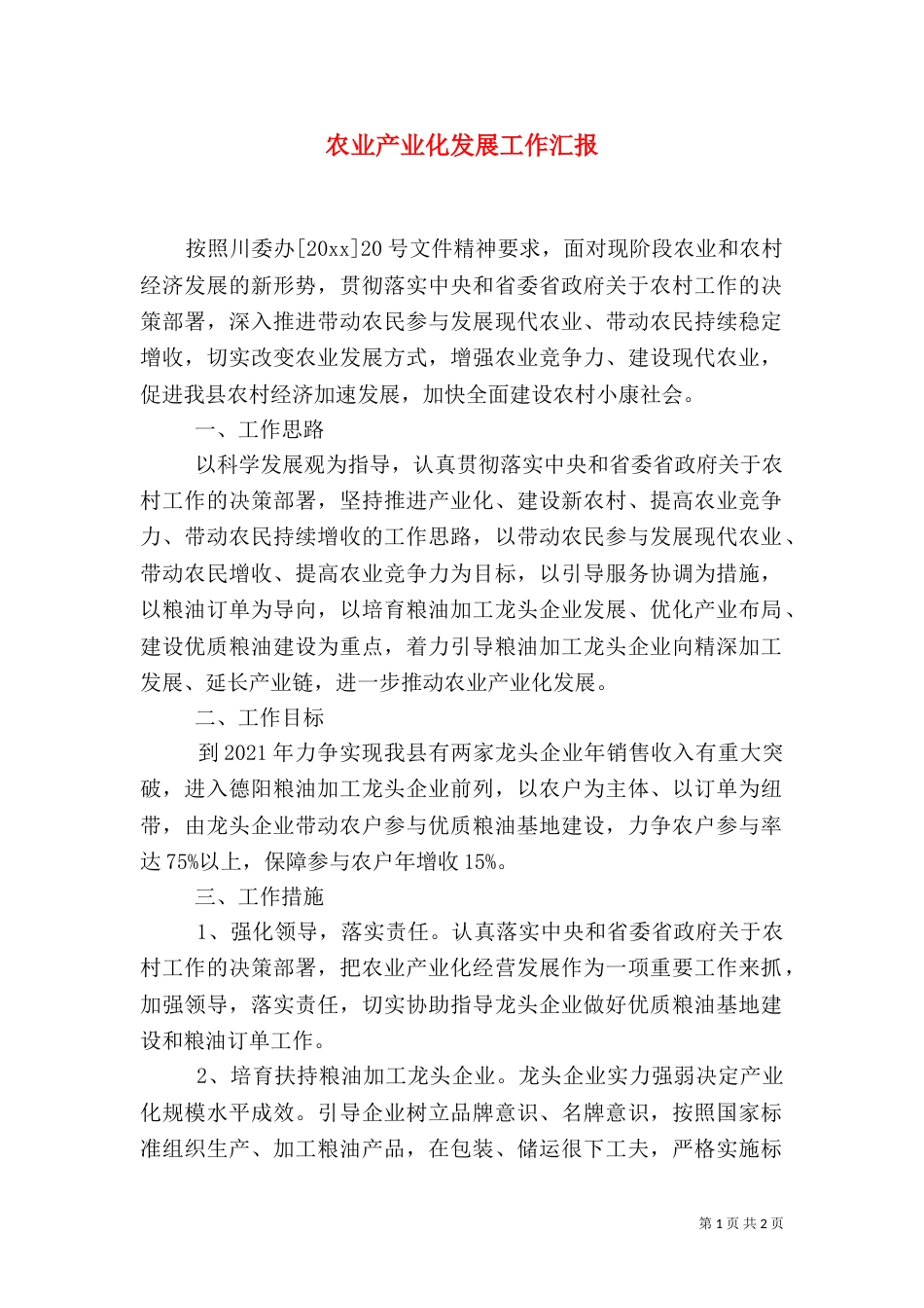 第1页共2页书山有路勤为径,学海无涯苦作舟。农业产业化发展工作汇报按照川委办[20xx]20号文件精神要求,面对现阶段农业和农村经济发展的新...