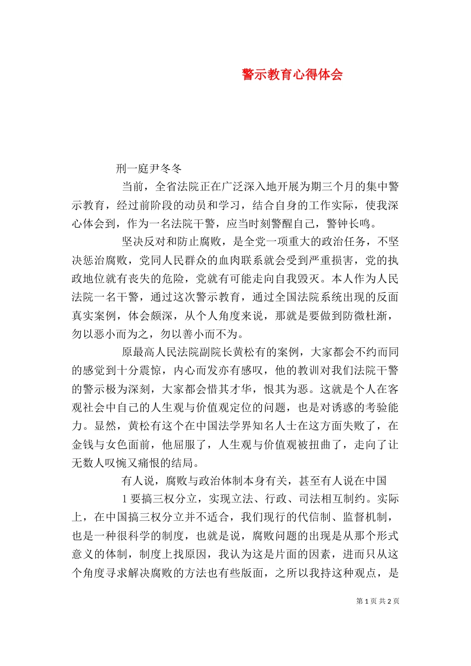 第1页共2页警示教育心得体会刑一庭尹冬冬当前,全省法院正在广泛深入地开展为期三个月的集中警示教育,经过前阶段的动员和学习,结合自身的...