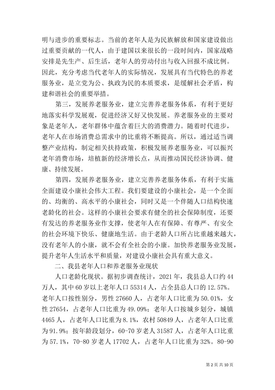 第1页共10页推进养老体系建设调研报告随着经济社会的发展,物质财富与精神生活同时提升,医疗卫生保健事业快速改善,我县人口老龄化不断加...