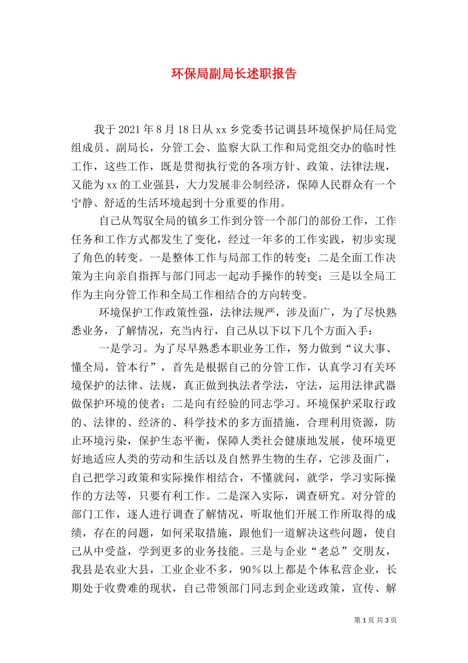 第1页共3页环保局副局长述职报告我于2021年8月18日从xx乡党委书记调县环境保护局任局党组成员、副局长,分管工会、监察大队工作和局党组交...