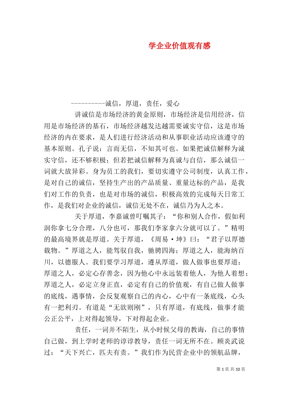第1页共10页学企业价值观有感----------诚信,厚道,责任,爱心讲诚信是市场经济的黄金原则,市场经济是信用经济,信用是市场经济的基石,...