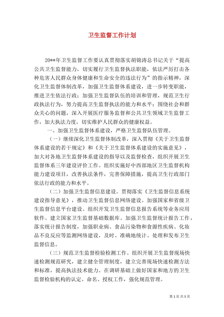 第1页共5页书山有路勤为径,学海无涯苦作舟。卫生监督工作计划20**年卫生监督工作要认真贯彻落实胡锦涛总书记关于“提高公共卫生监督能力,...