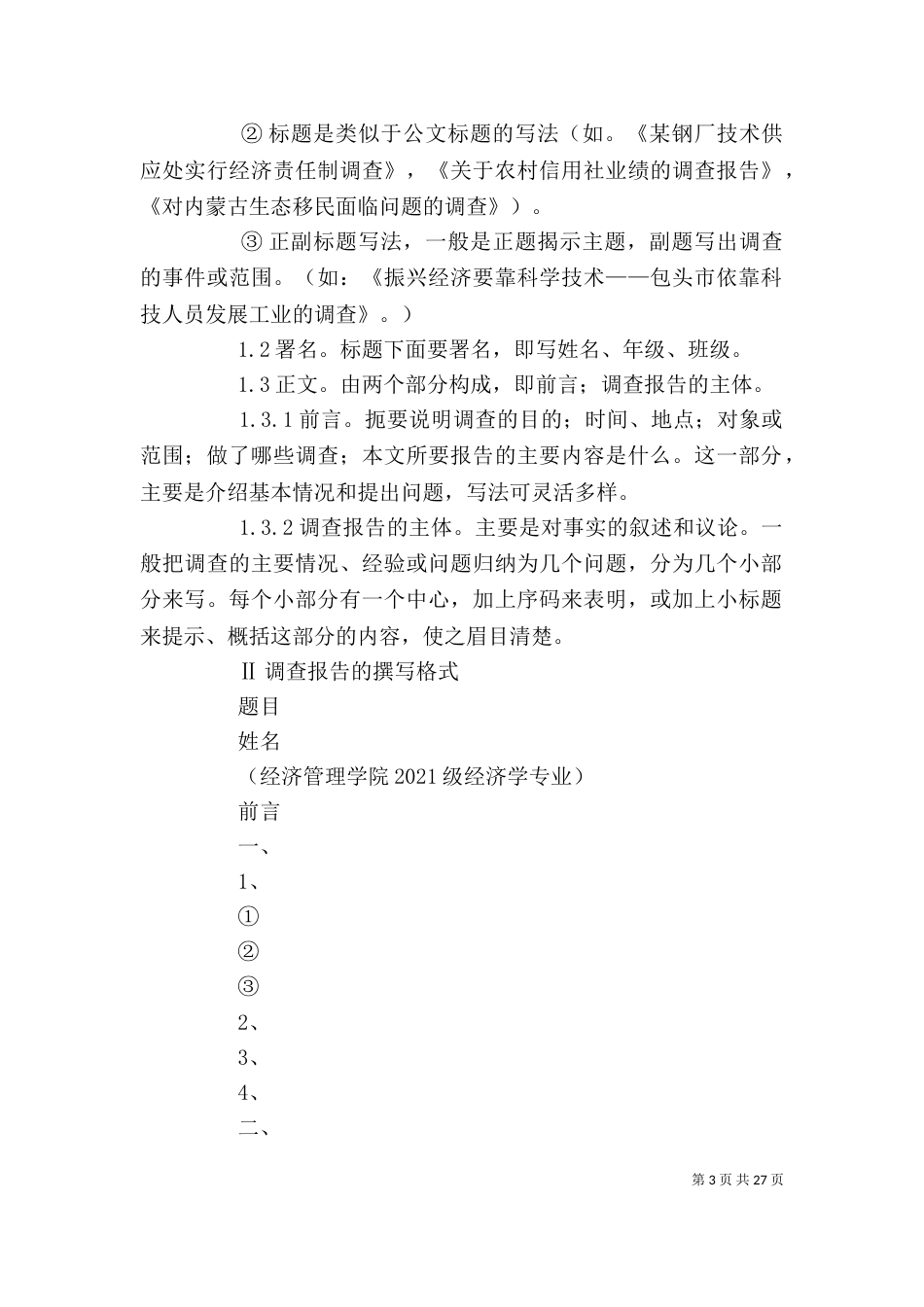 第1页共27页问卷调查报告的格式讲两个问题:调查报告的写法调查报告的撰写格式Ⅰ调查报告的写法,包括标题、署名、正文。篇幅。3500-50...