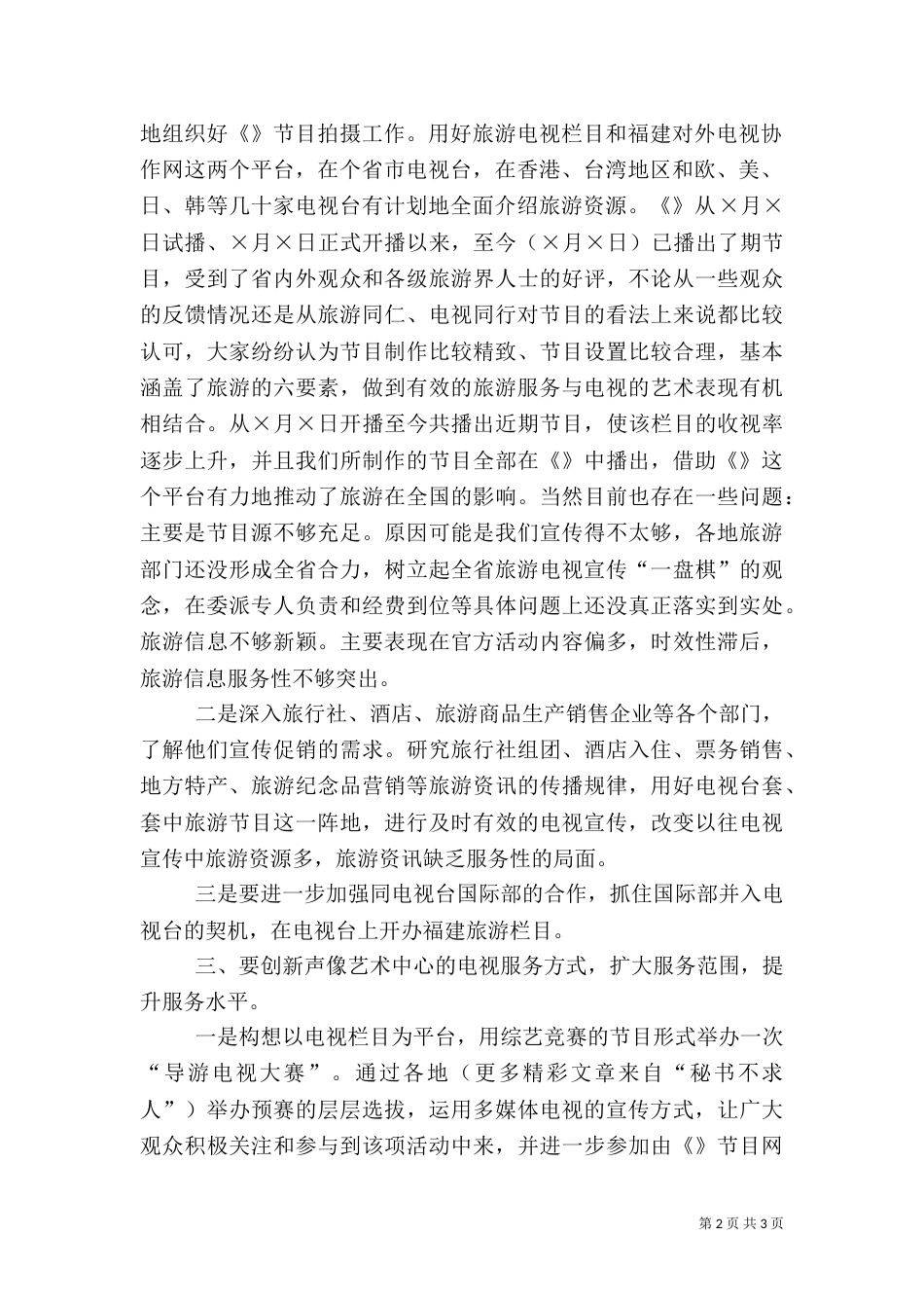 第1页共3页书山有路勤为径,学海无涯苦作舟。某中心二○○五年旅游电视工作思路各位领导、各位同志:大家好。今天借全省旅游市场开发工作会...