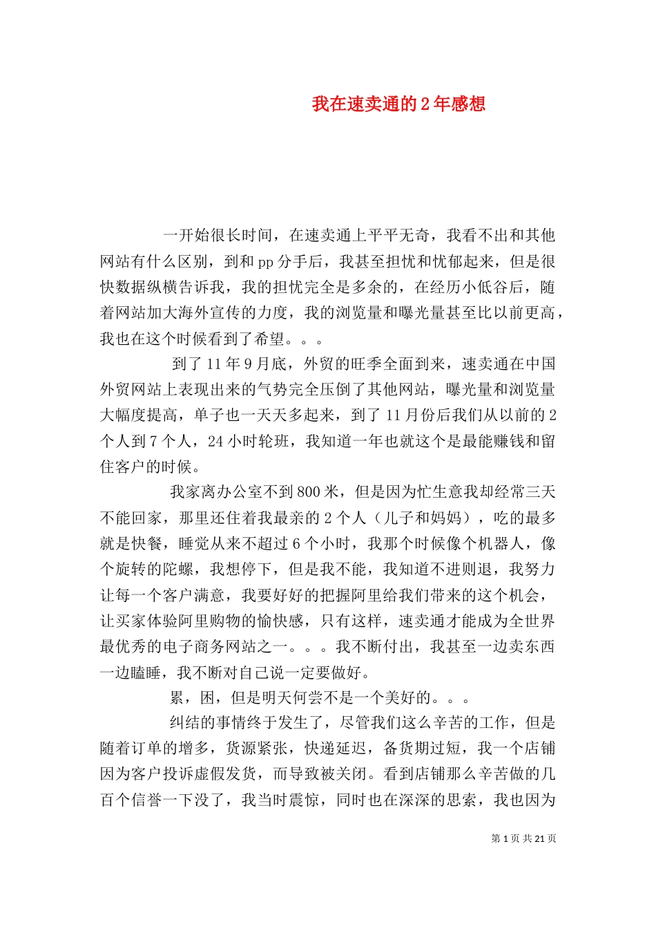 第1页共21页我在速卖通的2年感想一开始很长时间,在速卖通上平平无奇,我看不出和其他网站有什么区别,到和pp分手后,我甚至担忧和忧郁起来...