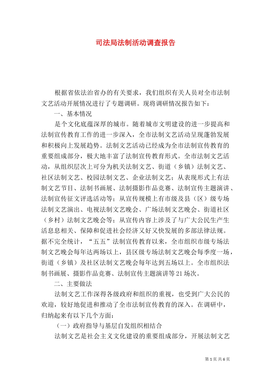 第1页共6页司法局法制活动调查报告根据省依法治省办的有关要求,我们组织有关人员对全市法制文艺活动开展情况进行了专题调研。现将调研情况...