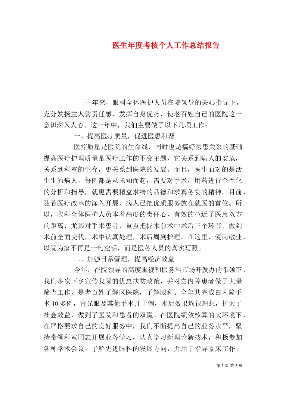 第1页共5页医生年度考核个人工作总结报告一年来,眼科全体医护人员在院领导的关心指导下,充分发扬主人翁责任感、发挥自身优势,使老百姓自...