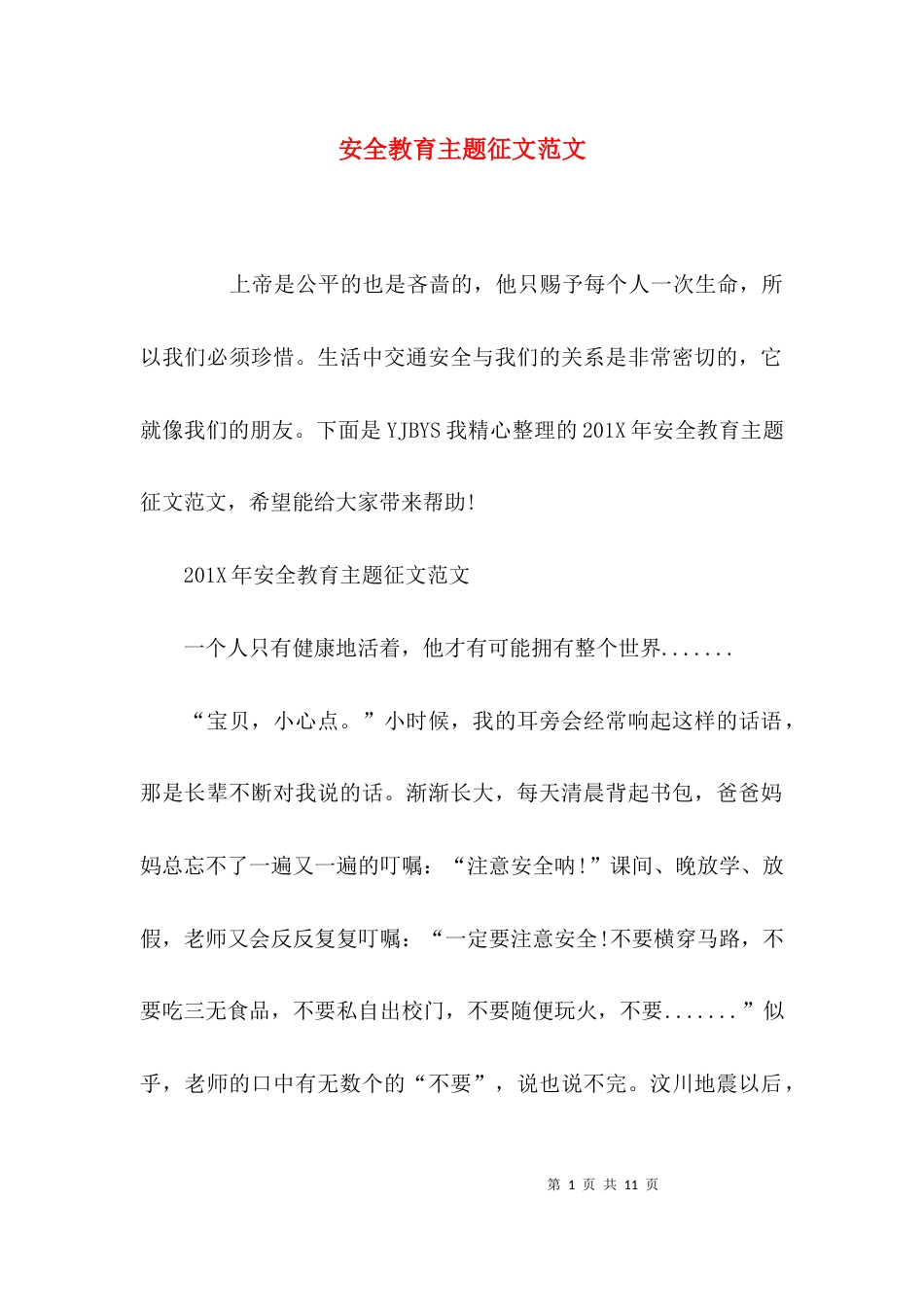 第1页共11页安全教育主题征文范文上帝是公平的也是吝啬的,他只赐予每个人一次生命,所以我们必须珍惜。生活中交通安全与我们的关系是非常...