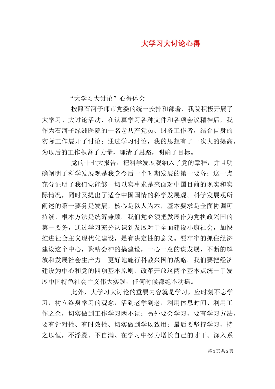 第1页共2页大学习大讨论心得“大学习大讨论”心得体会按照石河子师市党委的统一安排和部署,我院积极开展了大学习、大讨论活动,在认真学习...