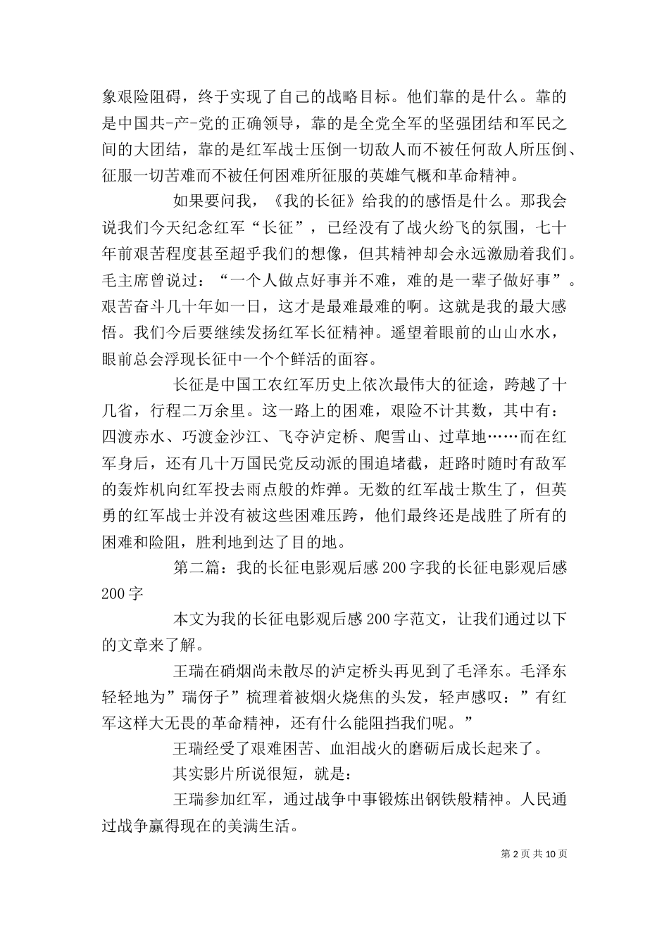 第1页共10页我的长征观后感200星期四上午,老师带领我们去看电影《我的长征》。这部电影主要是写一个老红军回忆他的长征经历。我最记忆深刻...