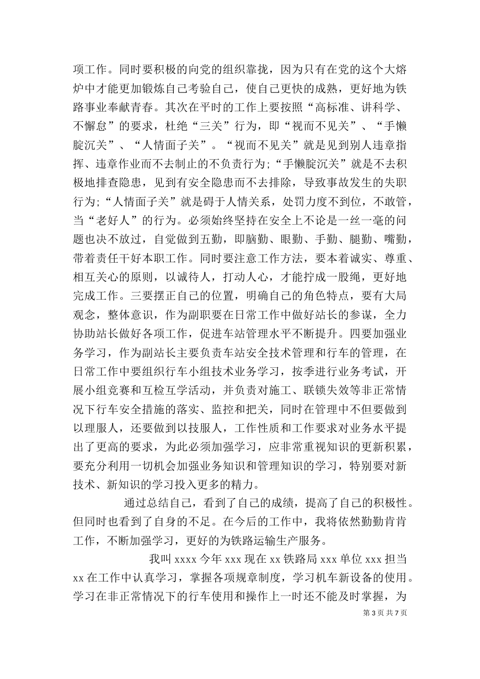 第1页共7页铁路个人工作总结回顾入路以来十六年的工作经历,我一直都在运输生产一线工作,从入路的第一天起我就认识到安全是铁路运输生产永...