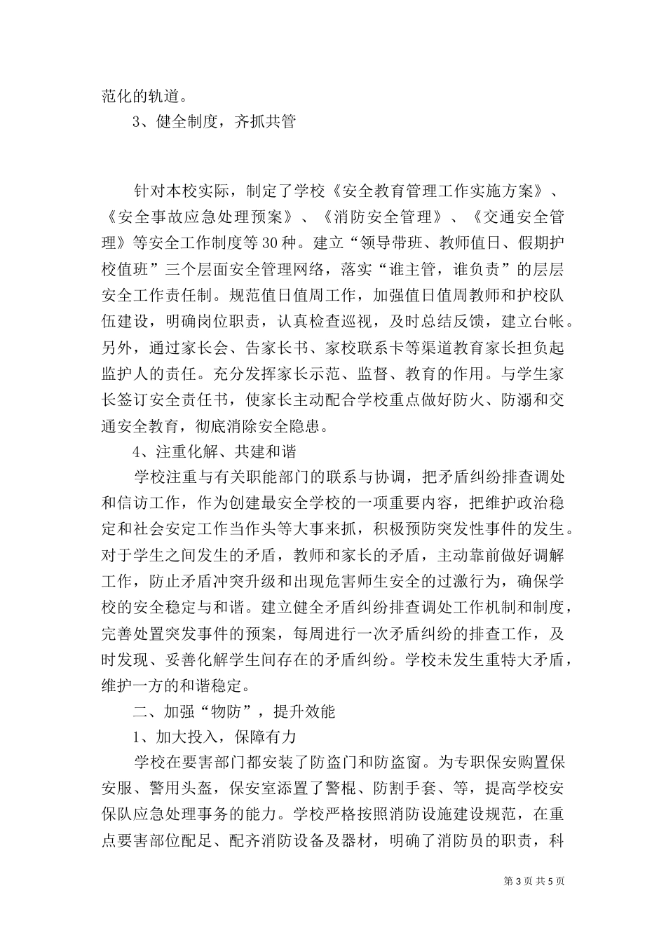 第1页共5页创建“平安校园”自评报告根据市教育局创建“平安校园”的政策精神,我校在创建“平安校园”的过程中,认真学习教育局相关文件精...