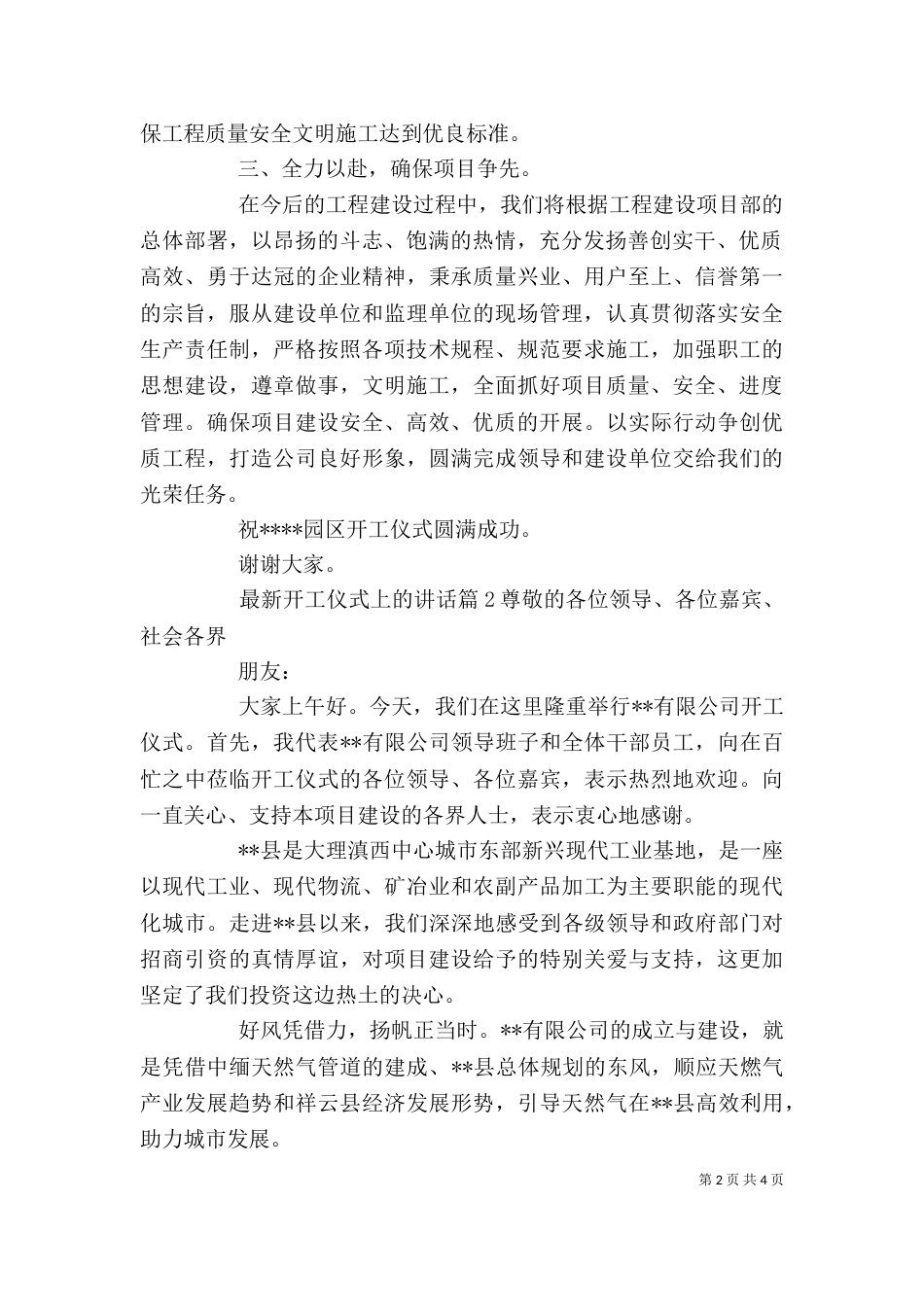 第1页共4页最新开工仪式上的讲话最新开工仪式上的讲话篇1尊敬的各位领导、各位来宾:今天我们作为工程建设的施工单位之一,参加****园区开...