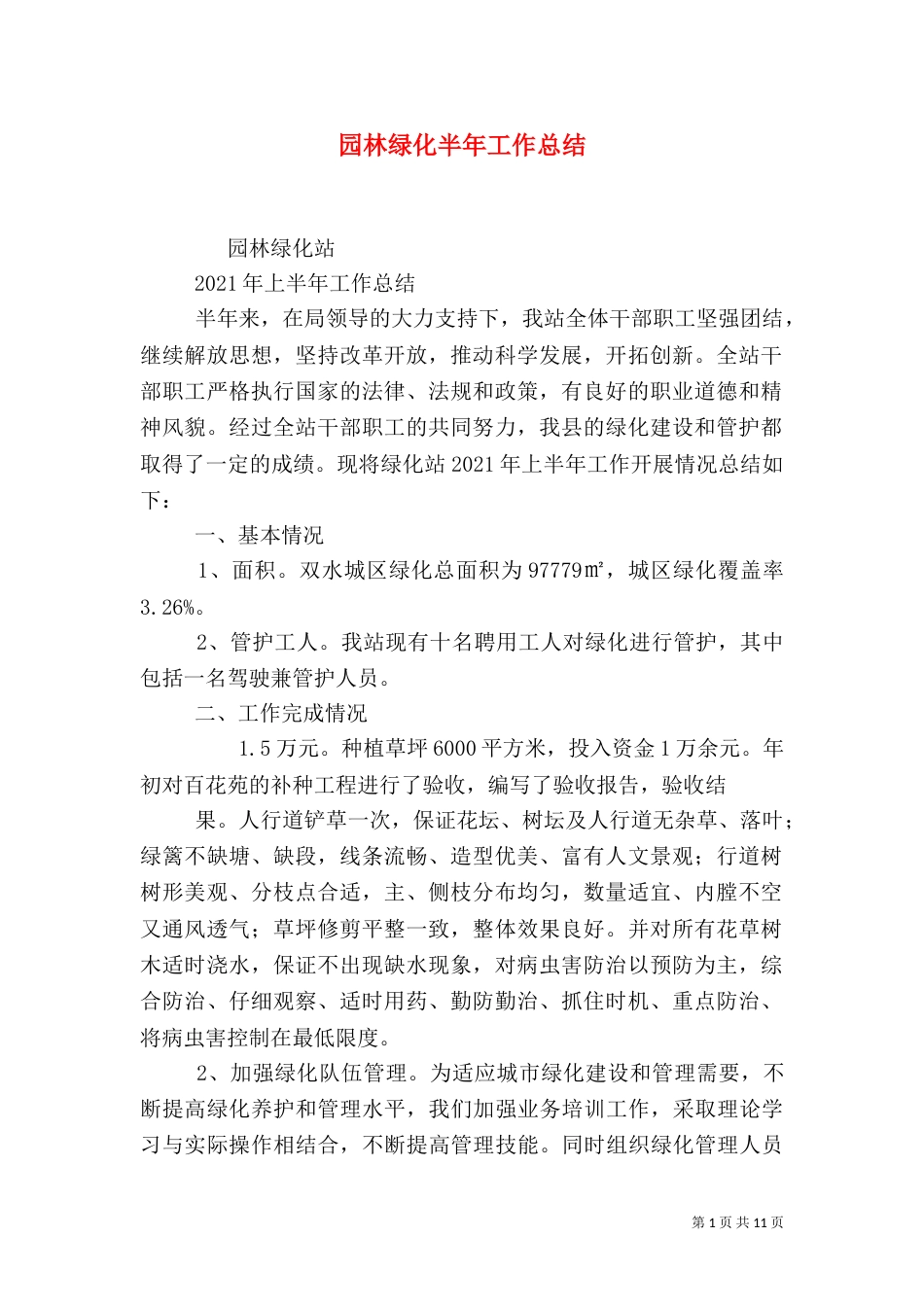 第1页共11页书山有路勤为径,学海无涯苦作舟。园林绿化半年工作总结园林绿化站2021年上半年工作总结半年来,在局领导的大力支持下,我站全...