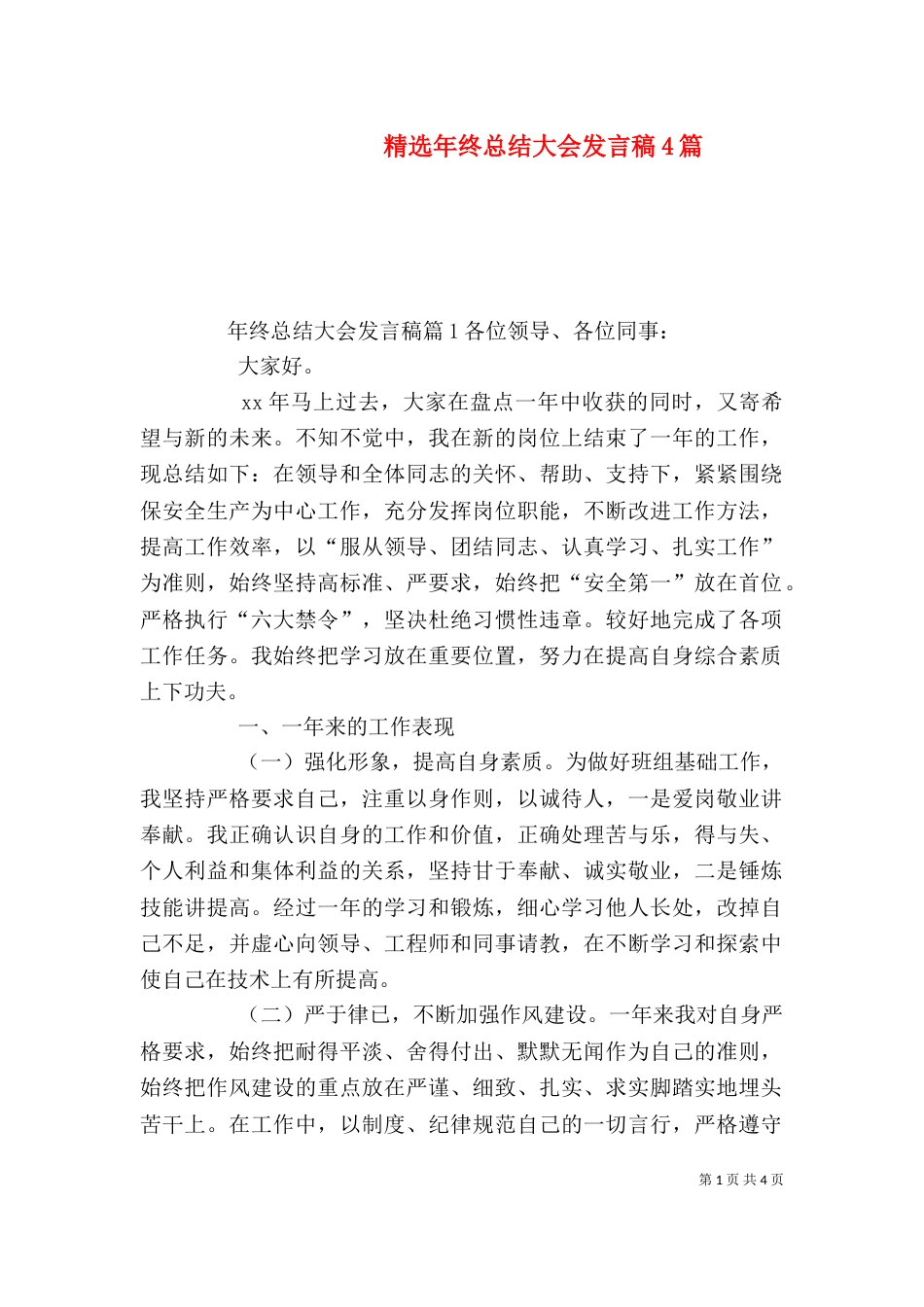 第1页共4页精选年终总结大会发言稿4篇年终总结大会发言稿篇1各位领导、各位同事:大家好。xx年马上过去,大家在盘点一年中收获的同时,又寄...