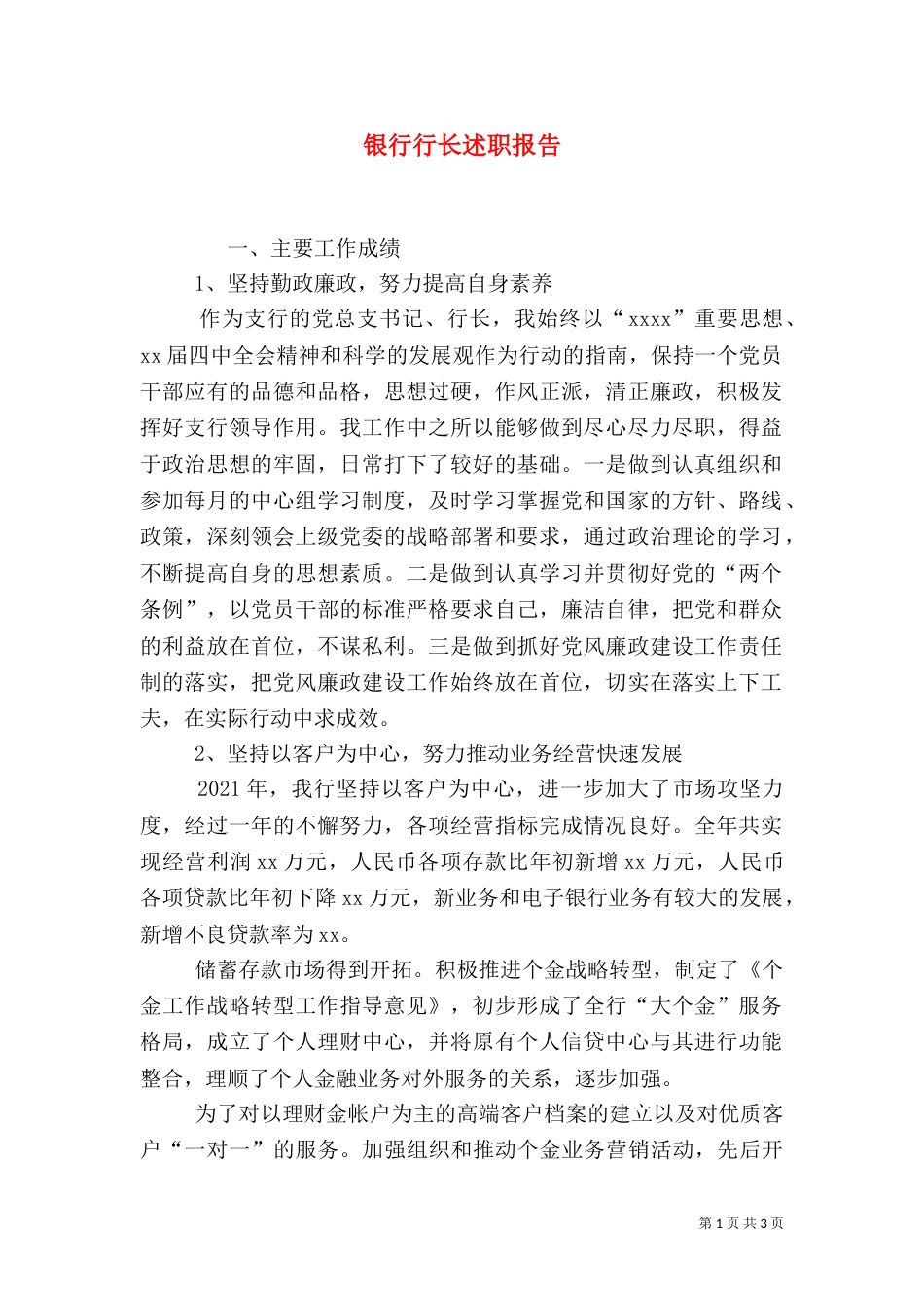 第1页共3页书山有路勤为径,学海无涯苦作舟。银行行长述职报告一、主要工作成绩1、坚持勤政廉政,努力提高自身素养作为支行的党总支书记、...