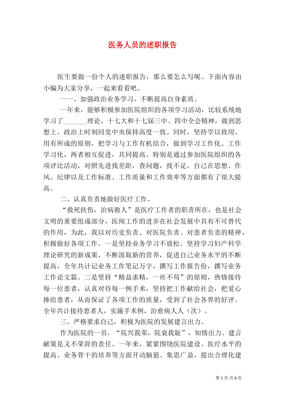第1页共6页书山有路勤为径,学海无涯苦作舟。医务人员的述职报告医生要做一份个人的述职报告,那么要怎么写呢。下面内容由小编为大家分享,...