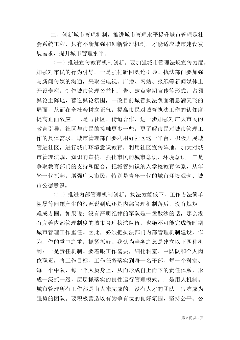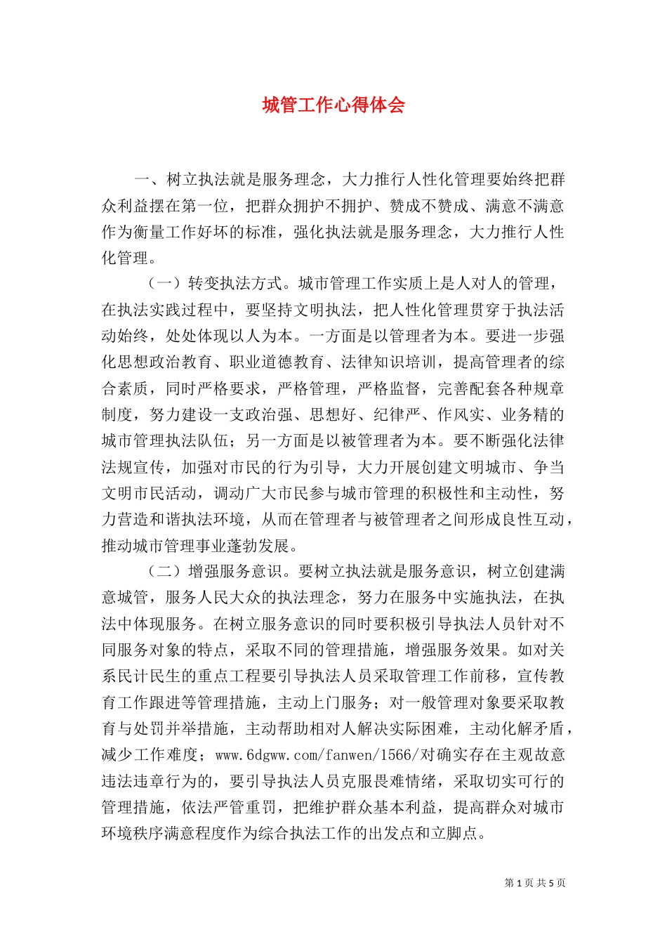 第1页共5页书山有路勤为径,学海无涯苦作舟。城管工作心得体会一、树立执法就是服务理念,大力推行人性化管理要始终把群众利益摆在第一位,...