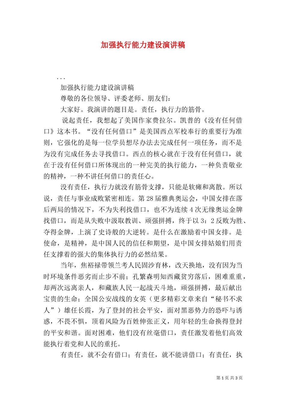 第1页共3页书山有路勤为径,学海无涯苦作舟。加强执行能力建设演讲稿...加强执行能力建设演讲稿尊敬的各位领导、评委老师、朋友们:大家好...