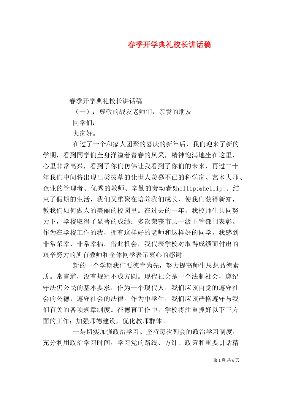 第1页共6页春季开学典礼校长讲话稿春季开学典礼校长讲话稿(一):尊敬的战友老师们,亲爱的朋友同学们:大家好。在过了一个和家人团聚的喜...