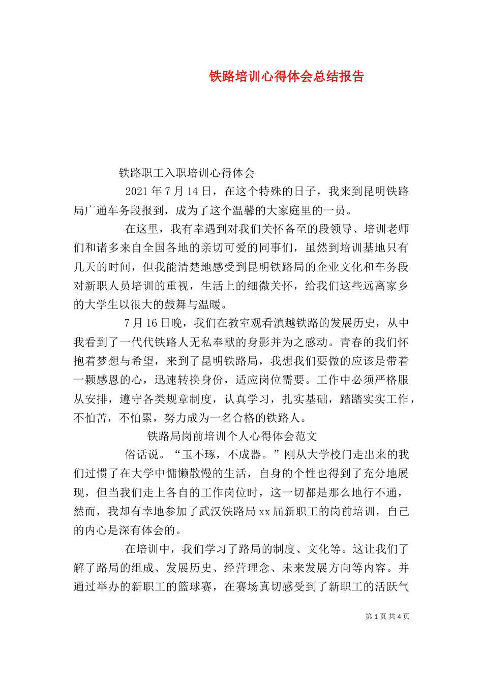 第1页共4页铁路培训心得体会总结报告铁路职工入职培训心得体会2021年7月14日,在这个特殊的日子,我来到昆明铁路局广通车务段报到,成为了...