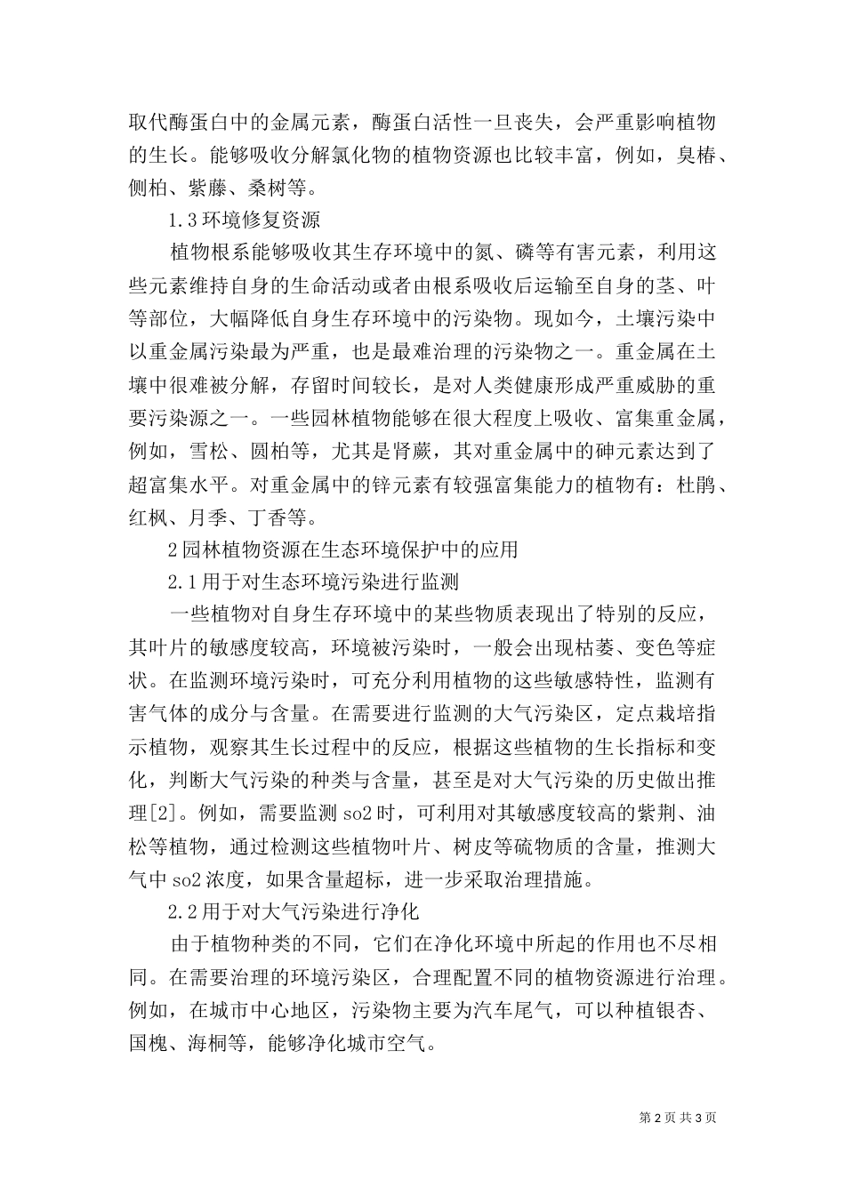 第1页共3页园林植物资源在生态环境保护中的应用关键词:园林植物;资源;生态环境保护;应用作为城市生态环境的主体,园林植物能够有效提升...