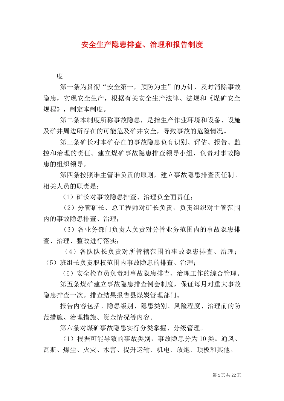 第1页共22页书山有路勤为径,学海无涯苦作舟。安全生产隐患排查、治理和报告制度度第一条为贯彻“安全第一,预防为主”的方针,及时消除事...