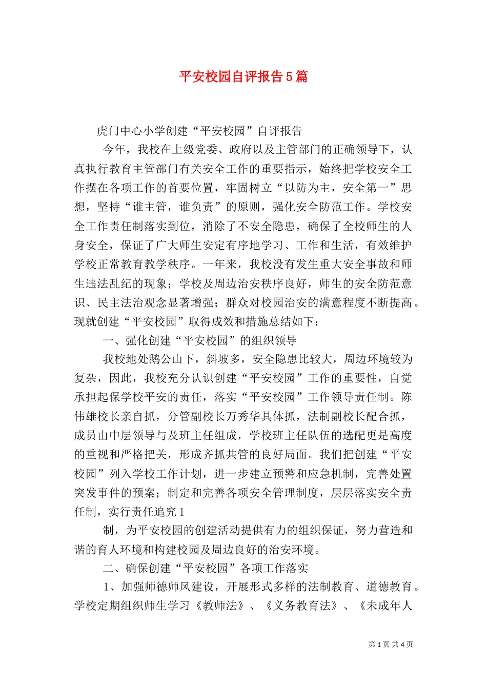 第1页共4页书山有路勤为径,学海无涯苦作舟。平安校园自评报告5篇虎门中心小学创建“平安校园”自评报告今年,我校在上级党委、政府以及主...