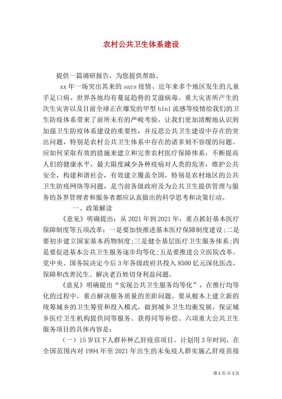 第1页共3页书山有路勤为径,学海无涯苦作舟。农村公共卫生体系建设提供一篇调研报告,为您提供帮助。xx年一场突出其来的sars疫情、近年来多...
