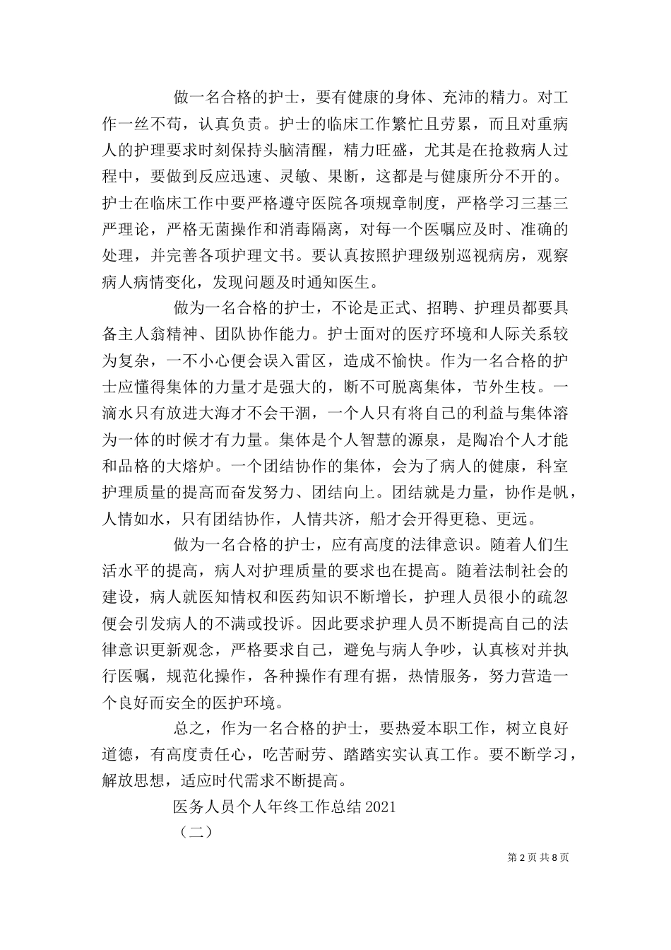 第1页共8页医务人员个人年终工作总结范文5篇精选医务人员个人年终工作总结2021(一)2021年我怀着喜悦的心情走上了工作岗位,成为了一名护...