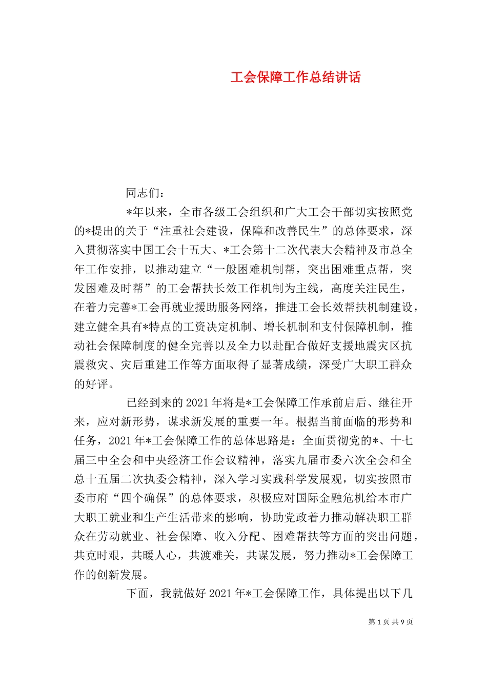 第1页共9页工会保障工作总结讲话同志们:*年以来,全市各级工会组织和广大工会干部切实按照党的*提出的关于“注重社会建设,保障和改善民生...