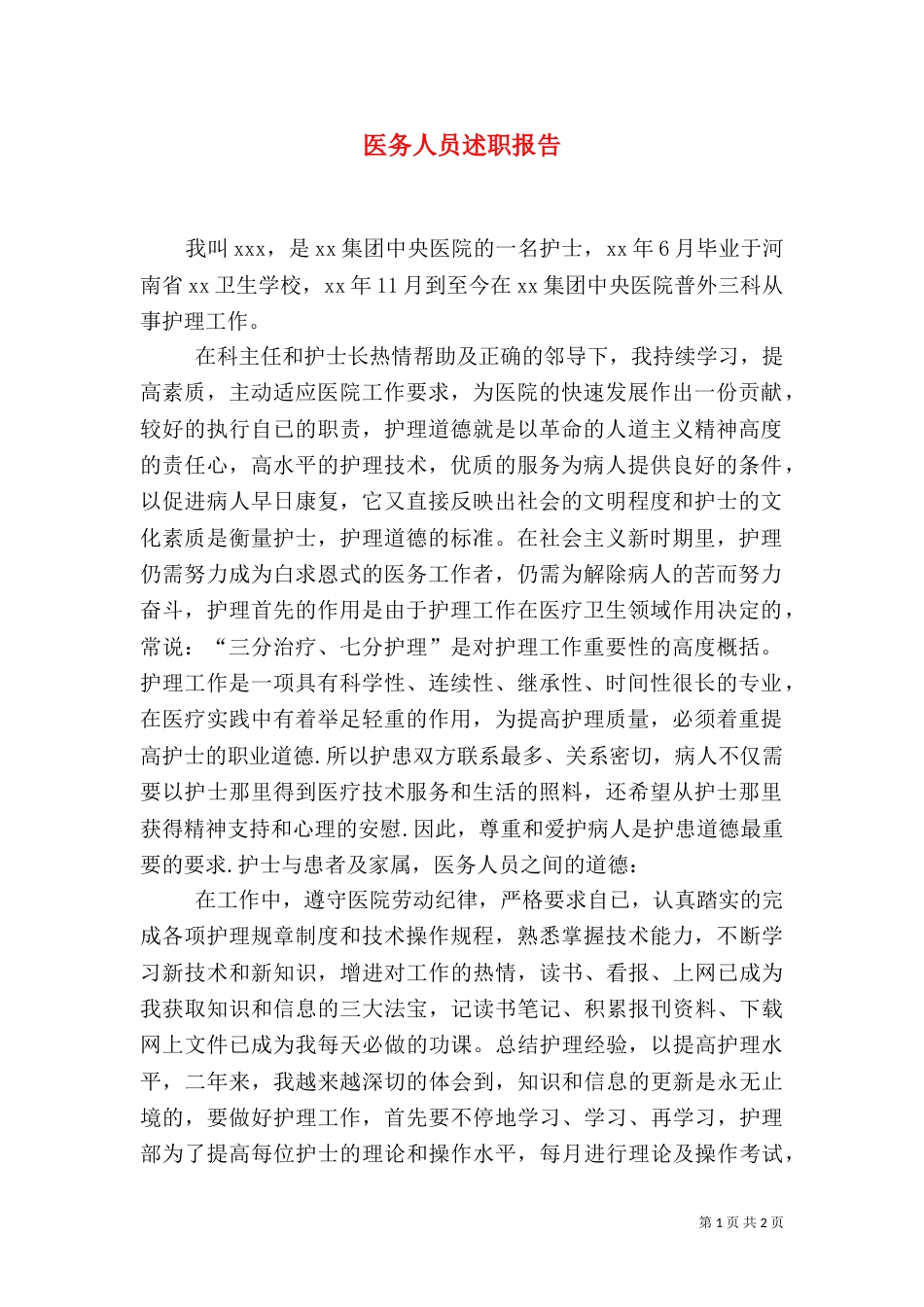 第1页共2页书山有路勤为径,学海无涯苦作舟。医务人员述职报告我叫xxx,是xx集团中央医院的一名护士,xx年6月毕业于河南省xx卫生学校,xx年...
