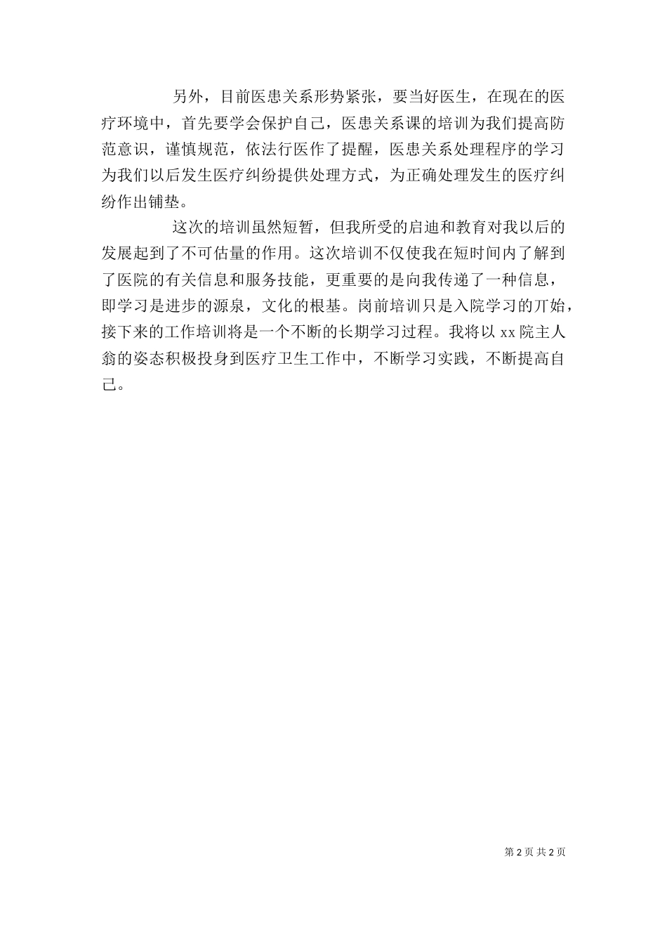 第1页共2页医院医生岗前培训心得体会在培训中,院长要求我们对待工作要勤奋、对待组织要敬业、对待上级要诚信、对待自己要自信。他剖析得非...