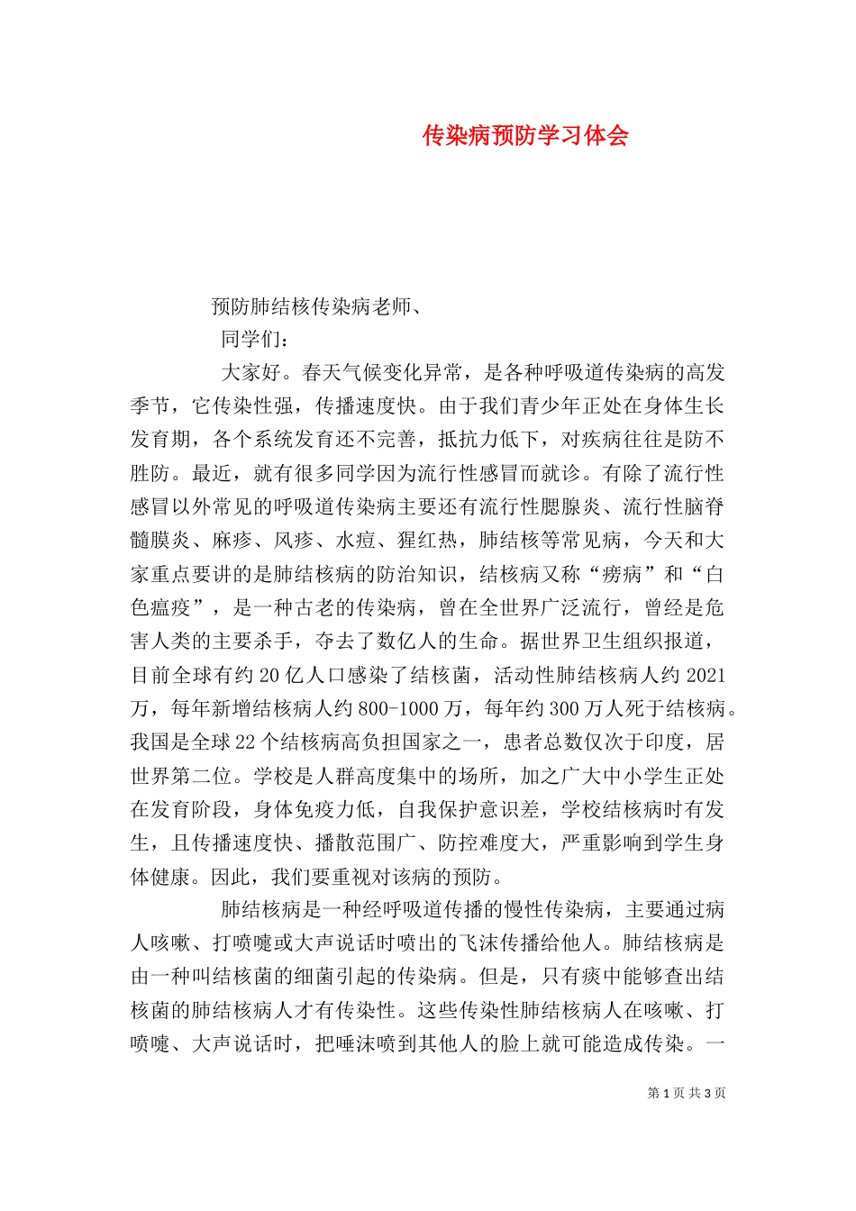 第1页共3页传染病预防学习体会预防肺结核传染病老师、同学们:大家好。春天气候变化异常,是各种呼吸道传染病的高发季节,它传染性强,传播...