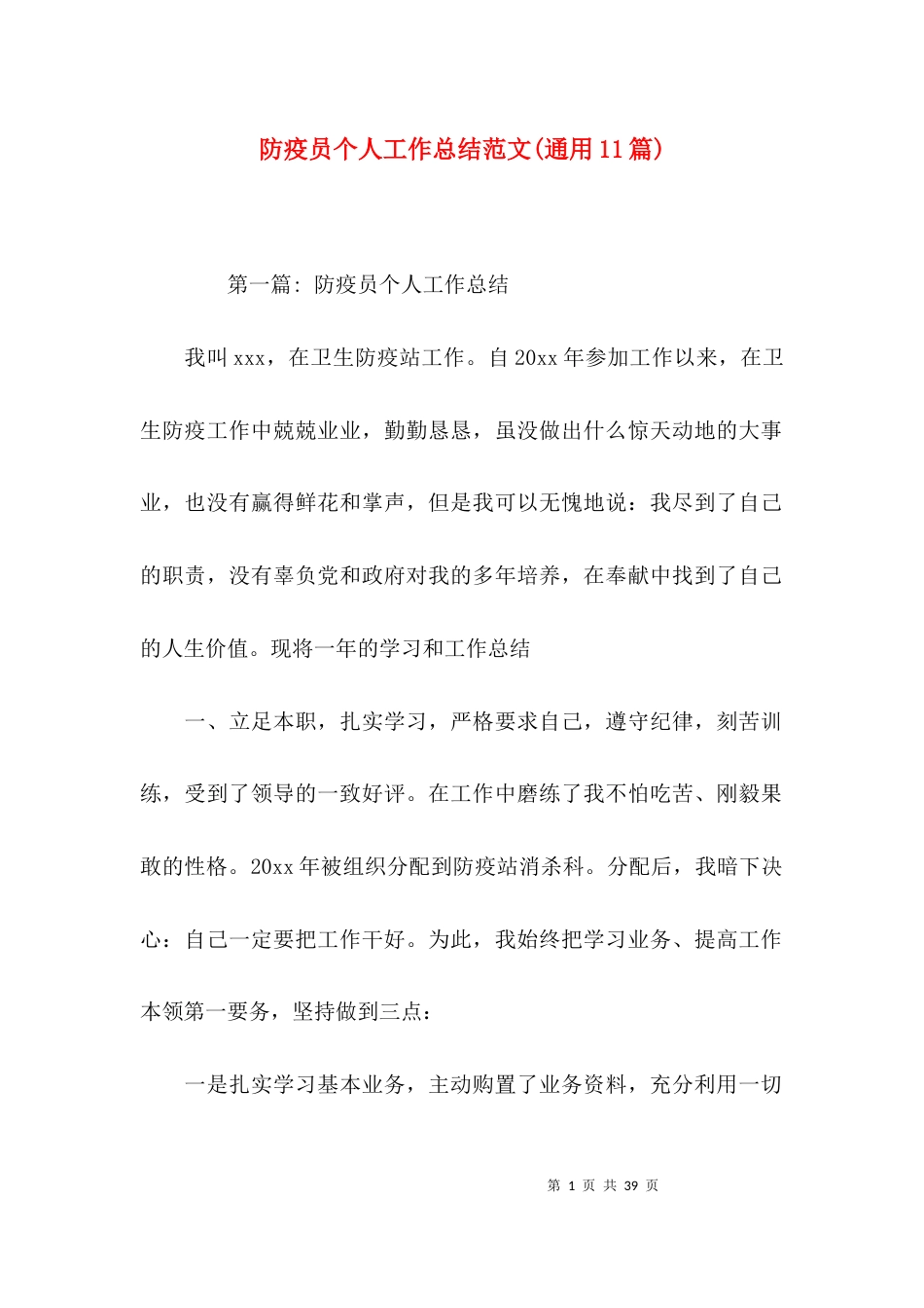 第1页共39页防疫员个人工作总结范文(通用11篇)第一篇:防疫员个人工作总结我叫xxx,在卫生防疫站工作。自20xx年参加工作以来,在卫生防疫工...