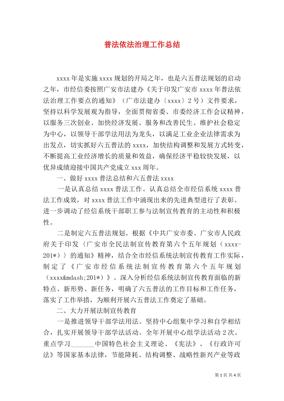 第1页共4页普法依法治理工作总结xxxx年是实施xxxx规划的开局之年,也是六五普法规划的启动之年,市经信委按照广安市法建办《关于印发广安市...