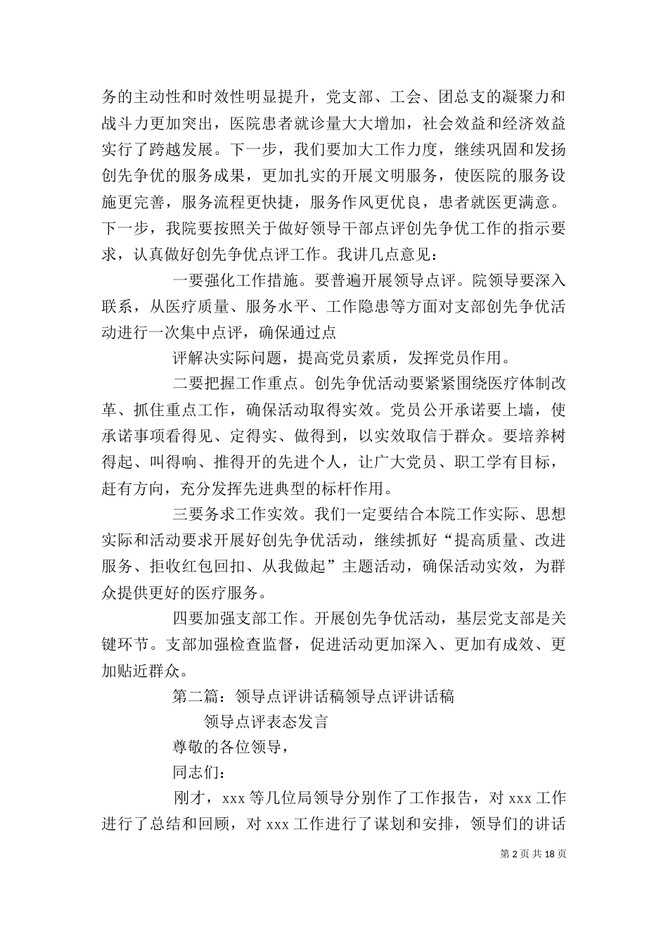 第1页共18页点评工作领导讲话稿靖西县妇幼保健院院长吴惠萍2021年,我院党支部按照县委的部署和要求,围绕医疗服务中心工作,以“文明服务...